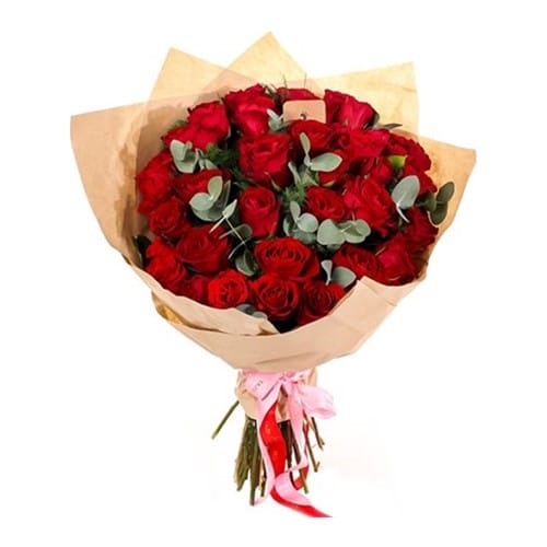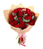 Kırmızı güller, turuncu çardak güller, okakiptus ve kurutulmuş lavanta kullanılarak hazırlanmıştır...